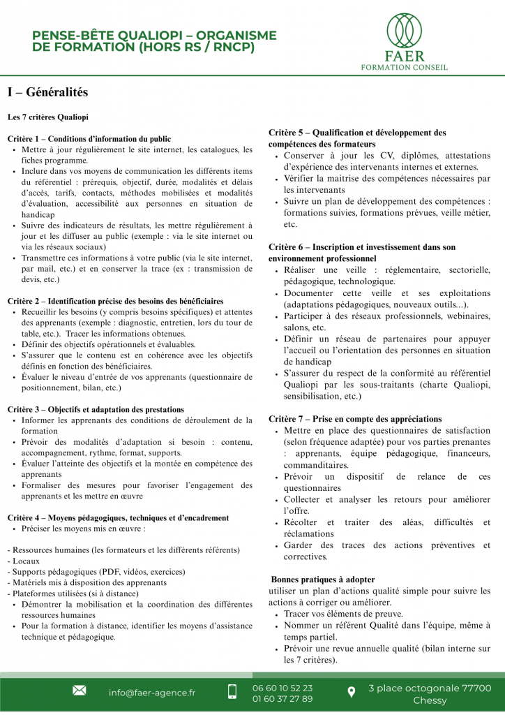 • Garder l’essentiel des 7 critères Qualiopi sous les yeux